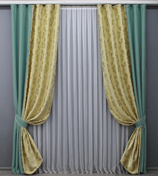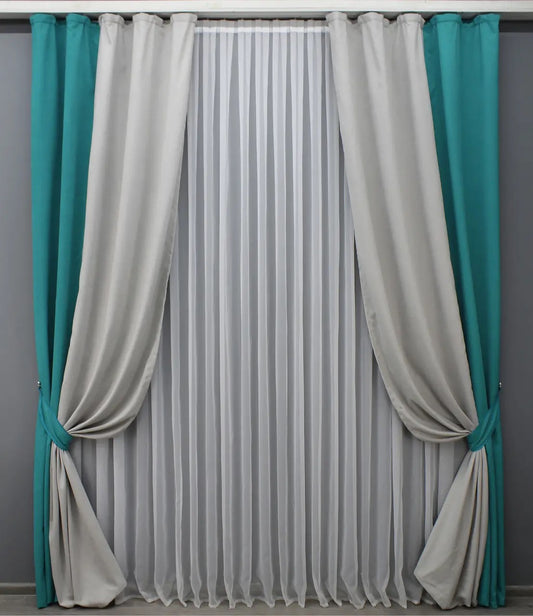 Turquoise & Beige Combined Blackout Curtains – Set of 2 Panels – “Elegance Duo” Collection