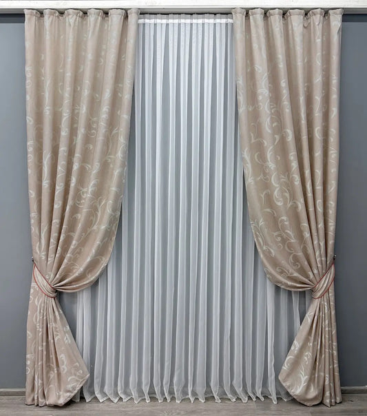 Elegant Sand with Grey Jacquard Curtains – Magic Collection – Set of 2 – 65% Light Blocking