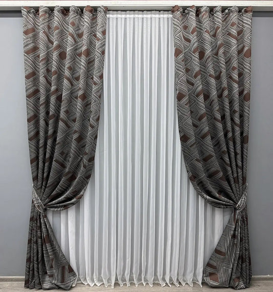 Elegant Grey with Brown Geometric Jacquard Curtains – Mystery Collection – Set of 2 – 65% Light Blocking