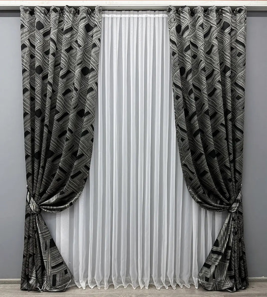 Elegant Grey with Black Geometric Jacquard Curtains – Mystery Collection – Set of 2 – 65% Light Blocking