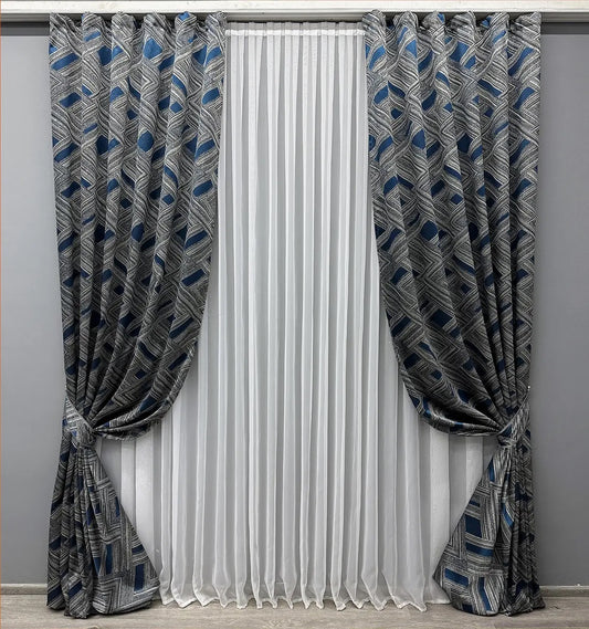 Elegant Grey with Dark Blue Geometric Jacquard Curtains – Mystery Collection – Set of 2 – 65% Light Blocking