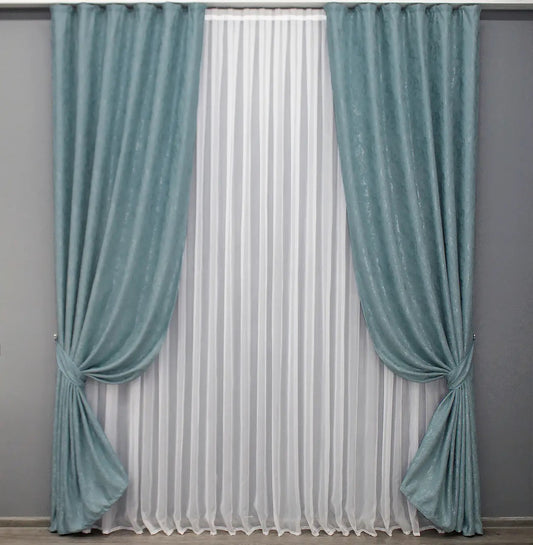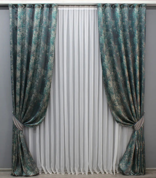 Linen Curtains with Marble Pattern – Green and Turquoise – Set of 2 Panels