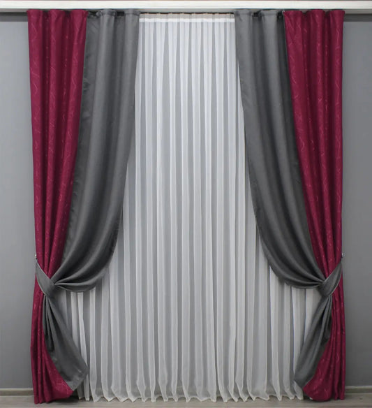 Burgundy & Grey Combined Curtains – Set of 2 Panels – “Linen Texture” Collection