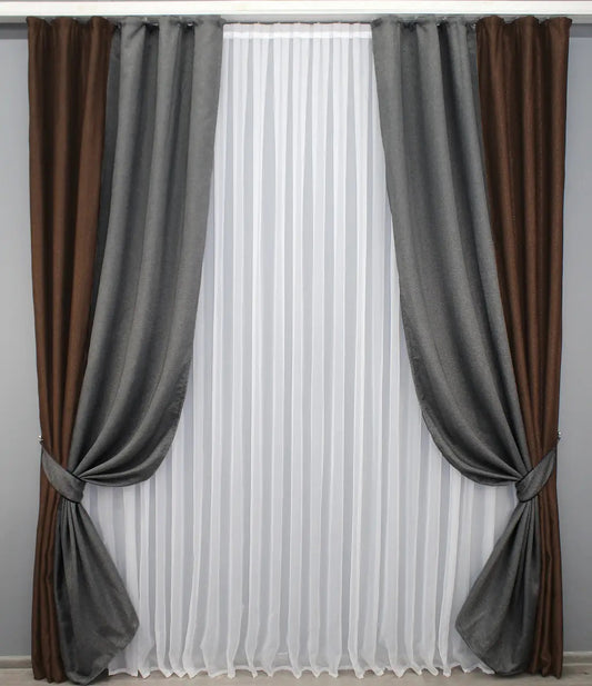 Brown & Gray Combined Linen Curtains – Set of 2 Panels – “Natural Harmony” Collection