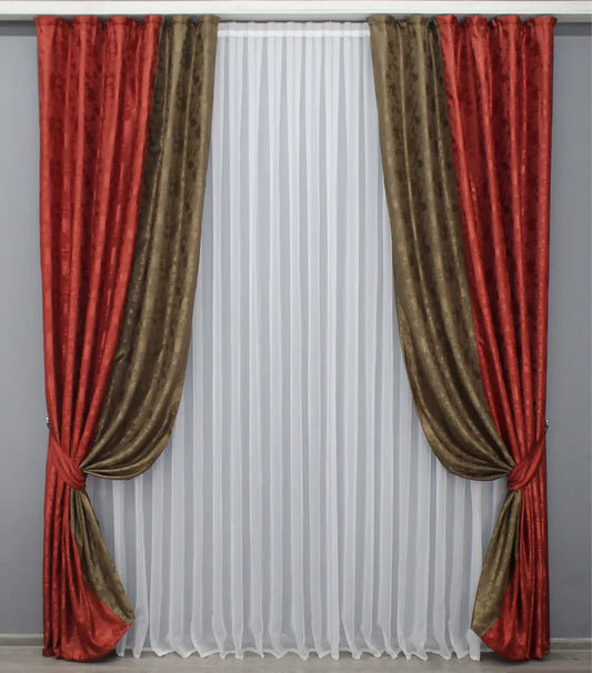 Red & Mocha Jacquard Combined Curtains – Set of 2 Panels – “Royal Elegance” Collection